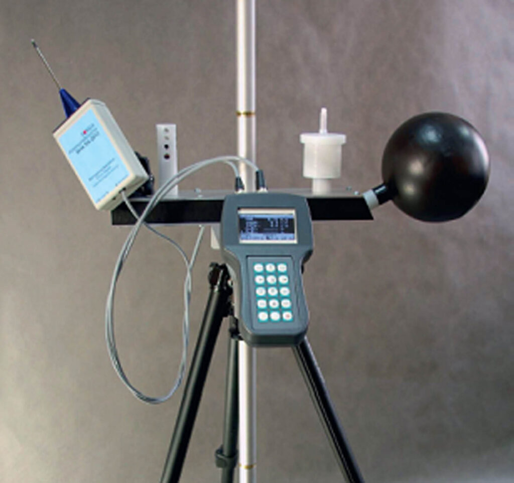 – Zestaw czujników do równoległego pomiaru na trzech poziomach (wszystkie czujniki x 3): czarna kula – miernik temperatury promieniowania cieplnego, termometr wilgotny z naturalną wentylacją, sonda psychrometryczna, sonda anemometryczna