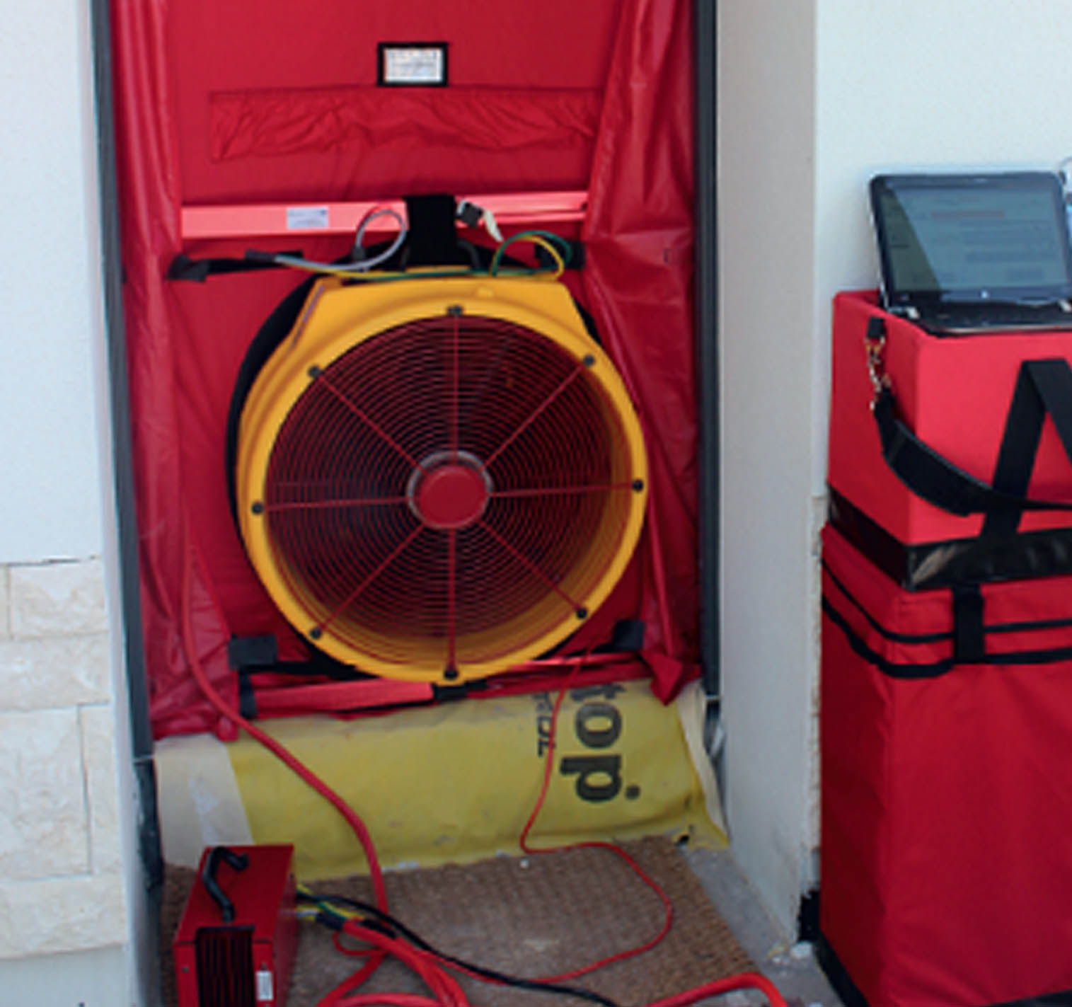 Dwa wentylatory z nylonową osłoną i silnikiem elektrycznym (moc 2,0HP, 220VAC) o wydajności od 2 x 8 m3/h do 2 x 14 100 m3/h przepływającego powietrza przy różnicy ciśnień 50Pa wyposażone w cyfrowy sterownik mikromanometr pozwalający na obserwację wyników badań w czasie rzeczywistym (w przypadku nieosiągnięcia wymaganego ciśnienie pozawala na wyliczenie krotności wymian powietrza i innych parametrów); w sztywnych torbach transportowych.